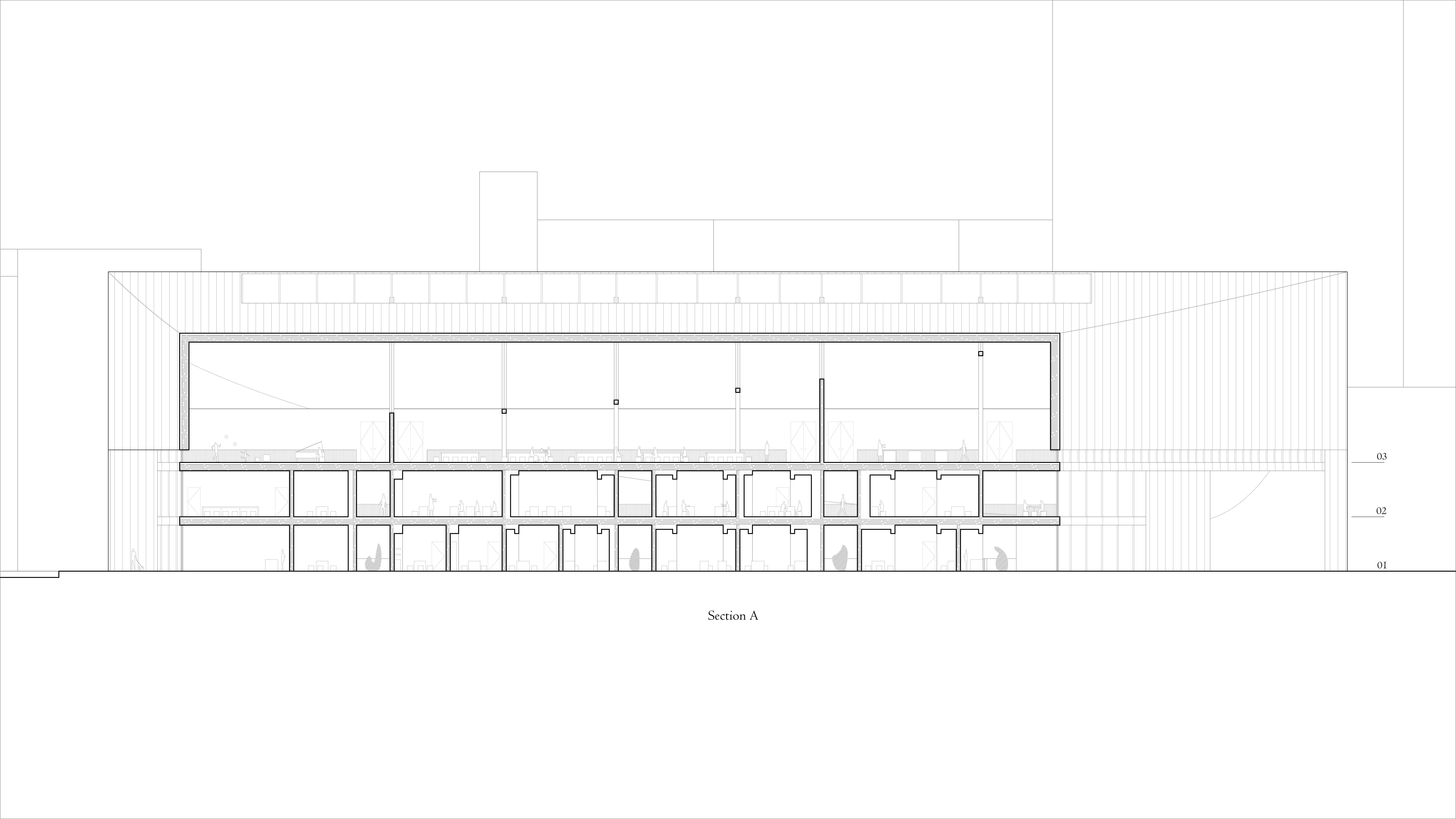 This project proposes a civic mat building sitting on the boundary between Chinatown and Leather District in downtown Boston, divided by a highway tunnel and heavy traffic. The design features a primary spine that cuts through the entire site, integrating the overall structure and connecting the key entry points on either side. Secondary pathways branch off from this main axis, mirroring the lateral connection between the two distinct zones and celebrating the binary spatial experiences as one meanders across the two sides. On the east side of the spine, the building is subdivided into various programs, including classrooms, meeting rooms on the first two floors, recreational space, and a banquet hall on the top floor. The interior walls on the first two floors gradually thicken from one side to the other along the main hallway, creating a sense of growth that can potentially expand beyond the site boundary. These thick walls are carved to be occupiable, making the smaller programs more intimate and private. In contrast, an expansive gallery occupies the other half, serving as a flexible space and potentially a collective shelter for extreme climate conditions. The monolithic massing and the curved roof form accentuate yet integrates the juxtaposition of the two halves, celebrating the transition between private and public areas.